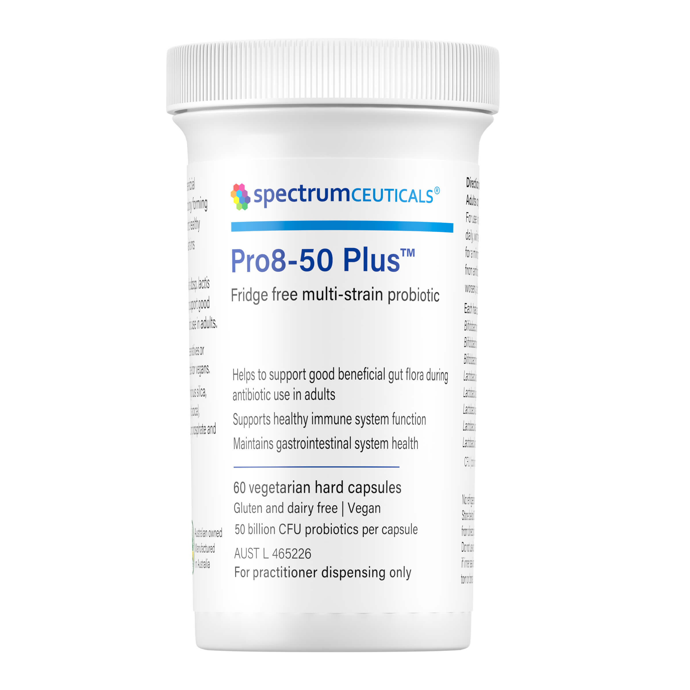 Pro8-50 Plus™ contains 8 strains of beneficial microorganisms with 50 billion colony forming units (CFUs) per capsule. Strains include L. rhamnosus, L. casei, L. acidophilus, L. plantarum, L. gasseri, B. lactis, B. breve and B. longum. This multi-strain probiotic formula supports gastrointestinal and general immune system health.